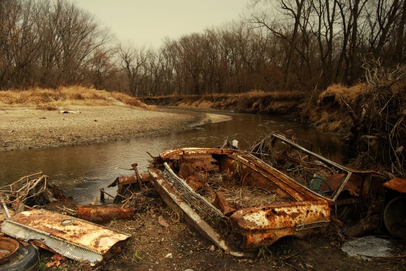 But I never noticed an old Ford Fairlane. I’ve no idea where it came from. It just appeared there after the flood. Whether it was somewhere farther upstream, whether it was buried in the creek bank, whether it was rusting away on somebody’s property—I don’t know. But there it is, like some would-be fossil uncovered by the forces of nature.