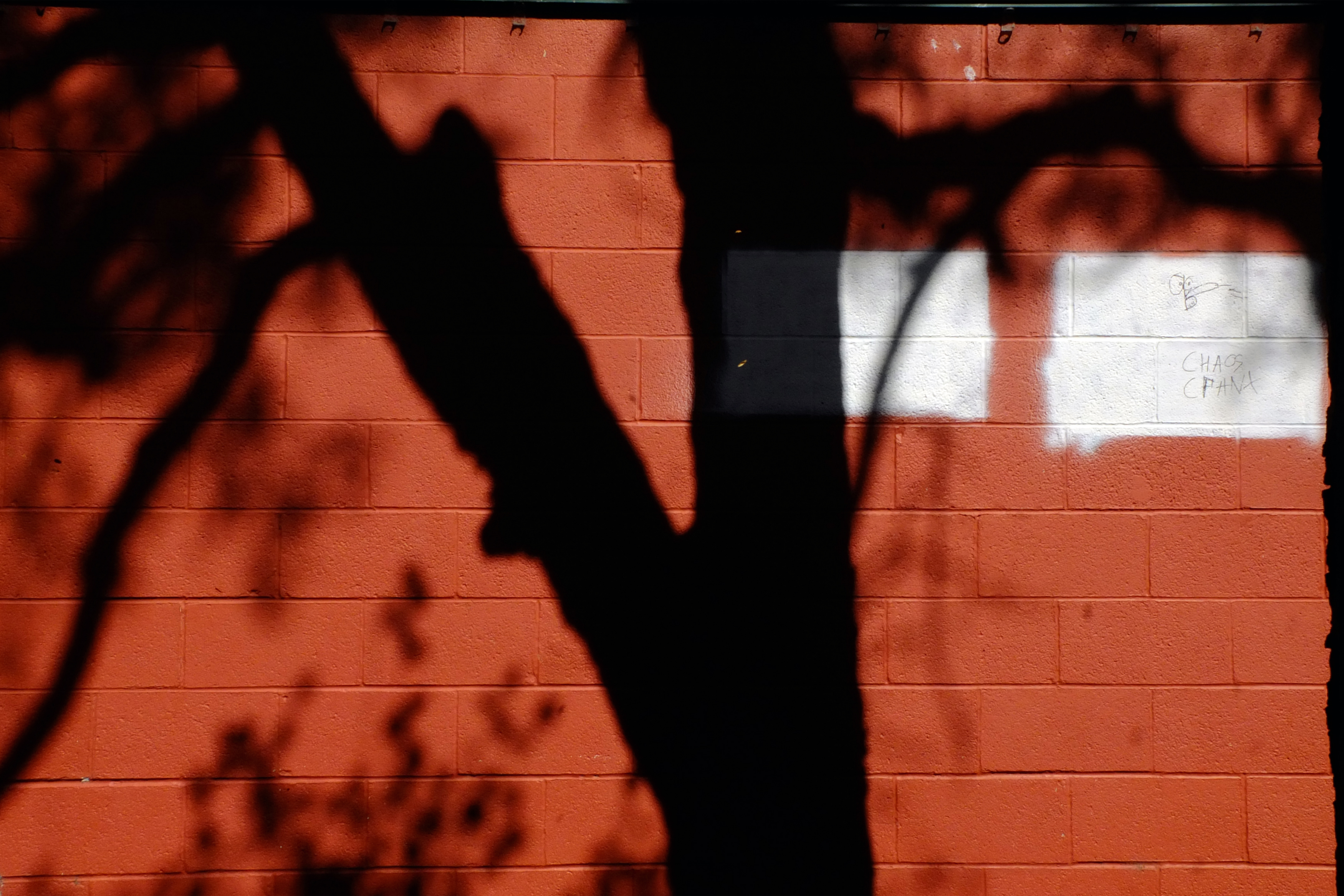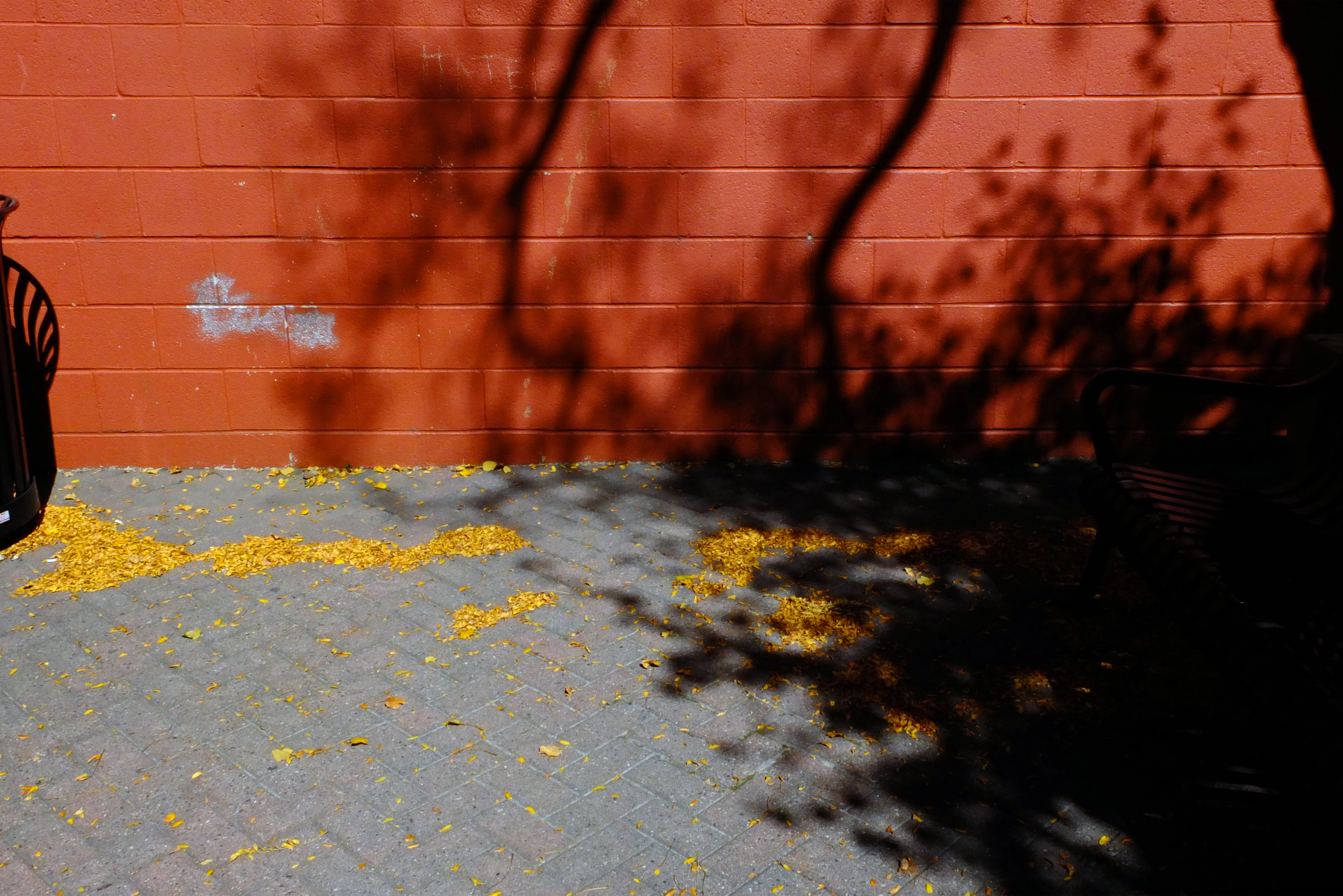A tree in this small alley-turned-courtyard obstructed the sunlight falling directly on the burnt sienna wall, resulting in a dark, self-similar shape of that tree. We’re able to see that tree because light within a certain spectrum falls on it; we see its shadow because light is prevented from falling on the wall. A shadow is the only thing we see because of the absence of light.