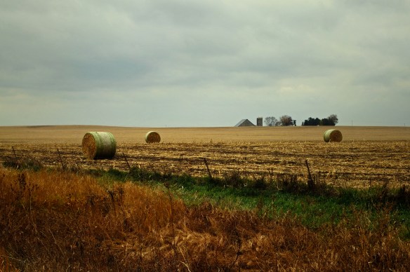 It also has a lot of sky, and fields that used to hold crops, and farm structures, and black dirt, and giant Tootsie Rolls made entirely of hay. I assume that’s hay. Or straw. Do people grow straw? What the hell IS straw? I’ve always assumed that whatever it is the farmers roll up into those massive pellets was something to feed cows. Or horses, maybe. Or, I don’t know, goats. Farm animals. Livestock. Although now I think of it, in the movies barns are always full of hay. Or straw. And some kid is constantly using a pitchfork to move it around from one part of the barn to another, though it’s never quite clear why. Maybe hay it’s like cat litter for horses. I don’t know.