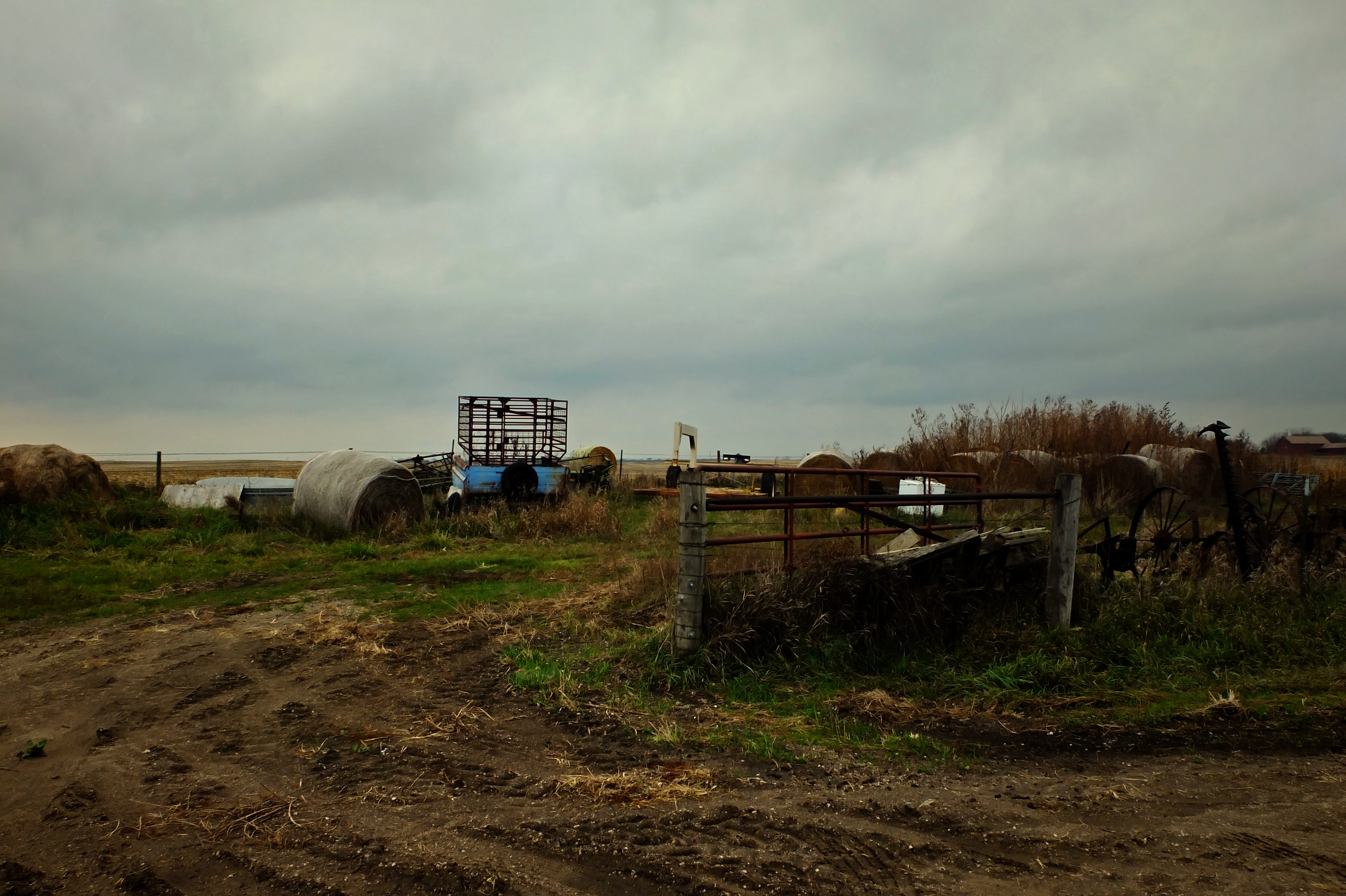 Equally intriguing (to me, at any rate) is the old farm equipment that gets shunted into small paddocks or stashed away behind sheds and barns. I find myself wondering if the farmers think this equipment might somehow come in handy in the future. As spare parts, maybe, or material that can be scavenged and cobbled together with other odd bits of this and that to create…well, something like that blue pick-up bed/trailer-looking unit that’s been attached to what appears to be the framework for some sort of enhanced interrogation device. Clearly that thing, whatever it is, was constructed with a purpose. Unless the wind just picked it up and deposited there, like Auntie Em’s house.