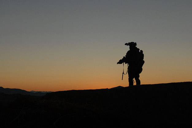 A U.S. Army Special Forces Soldier, with Special Operations Task Force – South, scans the horizon for enemy activity in Shah Wali Kot District, Kandahar Province, Afghanistan during a clearing operation Feb. 8, 2011 alongside Afghan Commandos from 2nd Company, 3rd Commando Kandak. U.S. Army photo by Staff Sgt. Jeremy D. Crisp