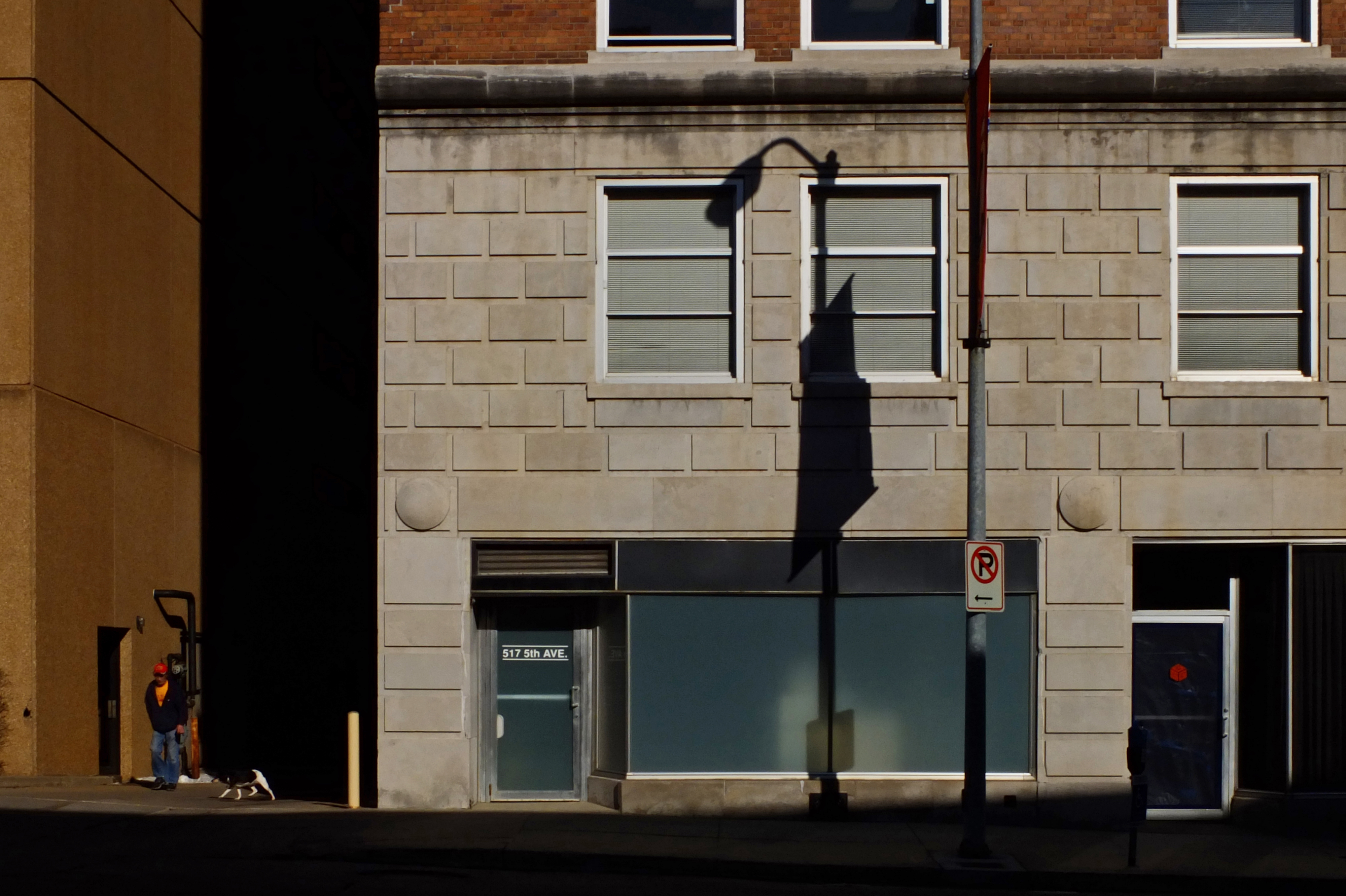 You have the eye, that’s for sure. I look at it and think, well, maybe if you cropped it down more horizontal, but then, no, you’d lose that great vertical shadow of the lamp, and the strong verticals really balance that horizontal layout, and I like the horizontal of the third story up there too. And then I thought, well, it would have been great to catch the dog jumping up, too. But this has a sort of anticipation to it, with the dog’s barely seen movement leading to something. The hat and that door- brilliant. And the echo in the no parking sign… All brilliant. And damn but you’re right that the red gets a bit lost. Though I kind of like the added layers of things to see that add to the overall composition and story- you may not notice them at first, but if you keep looking you notice. Delayed gratification or something. ;)