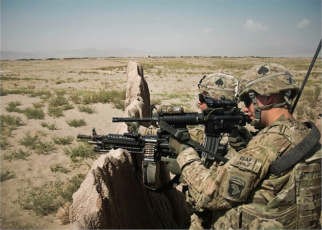 U.S. Army Pfc. Michael W. Daley Jr. (right) and Pfc. Travis B. Woolwine, both Soldiers with 1st Battalion, 506th Infantry Regiment, 4th Brigade Combat Team, 101st Airborne Division (Air Assault), scan their surroundings while on patrol in Paktya Province, Afghanistan / Photo by Sgt. Justin Moeller
