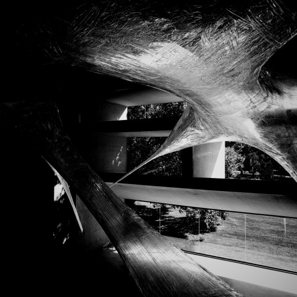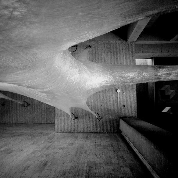 In this case, Numen / For Use used about 1400 pounds of translucent polypropolene tape to create an object that’s a cross between a giant spider’s web and a cocoon. There’s a single small circular opening in the bottom of the installation through which it can be entered (with the help of a small stairway). Folks can crawl, scoot, wriggle, and worm their way through the installation. At some points, it’s large enough to stand up inside.