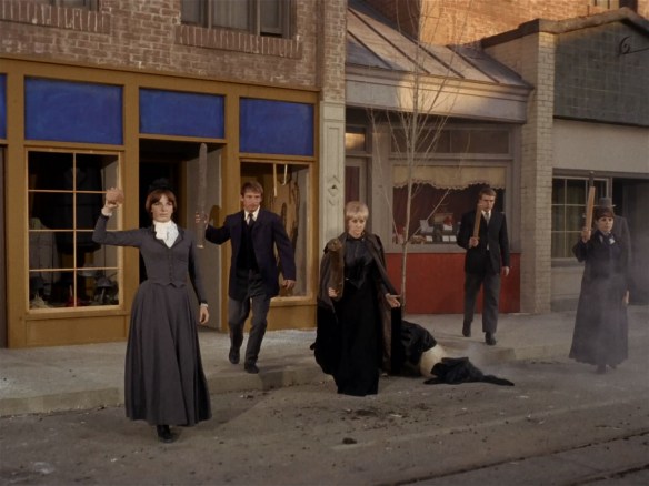 It’s a still from The Return of the Archons, a Star Trek episode from 1967. The episode takes place on planet Beta III in the C-111 system, ‘at the start of “Festival”, a period of violence, destruction, and sexual aggressiveness.’ Apparently during the Festival the inhabitants of Beta III arm themselves with baguettes and potatoes — not normally the weapons of choice for violence, destruction, and sexual aggressiveness. But, to quote an unnamed Freeper, there it is.
