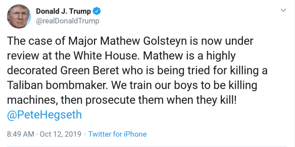 1. I suggest that Trump has little to no interest in understanding anything beyond making himself more wealthy or more powerful. Granted, he’s intelligent enough to know a hot-button issue (“disrespecting our military”), but that’s it. He couldn’t give two shits about Golsteyn or his case, except that he can use it to curry favour with the more brutal demographic.