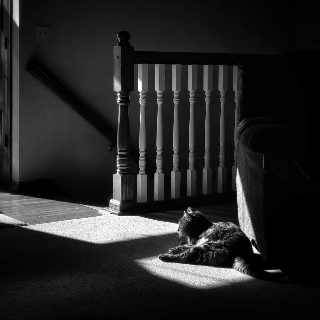 FACT 10: I noticed the cat sleeping in the sunlight from the open front door. The light illuminated seven of the balusters supporting the balustrade, meeting the requirements for the Utata photo challenge.