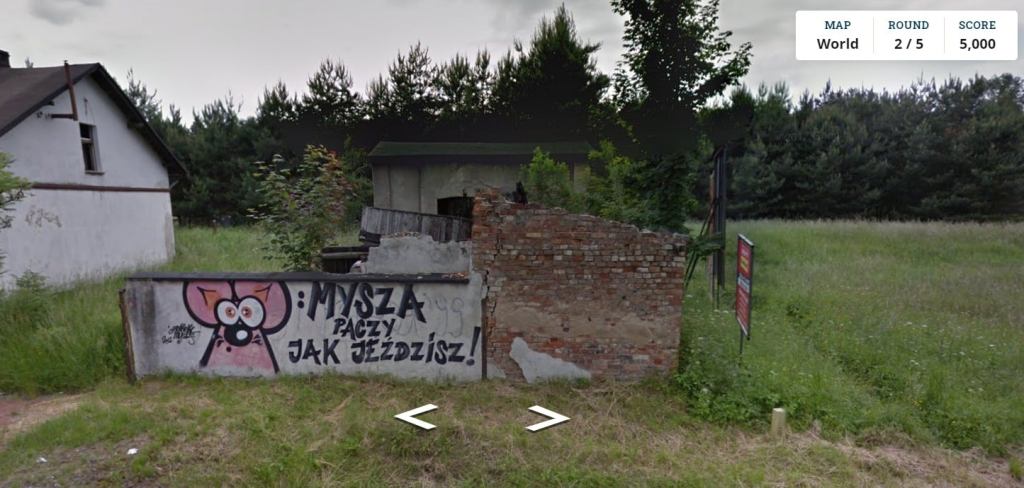 I don’t speak Polish. But I help run a Facebook group called Geoguessr Oddities, with a global membership some of whom were likely to know Polish. So I posted the screengrab. And a short time later I learned Mysza Patrzy jak Jedzisz translates to “The Mouse watches you drive.” It wasn’t very helpful in finding out where I was in Poland, but the translation cracked me up, and the interaction itself made me happy. Then this morning another member of the group informed me that franekmysza is a Polish graffiti artist with an Instagram account. He’s painted that mouse all over Poland.