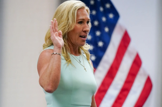 Marjorie Taylor Greene swearing to tell the truth, the whole truth, and nothing but the truth except when she can dodge it.
