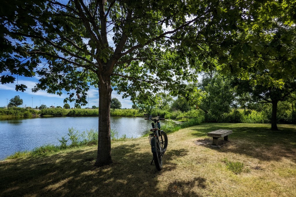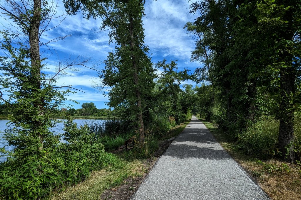 Riding on weekdays also means I often have the bike paths and trails all to myself. When I do encounter other cyclists, they’re usually folks like me. Relaxed, lackadaisical riders who are maybe retired, maybe unconventionally employed, maybe skipping work. Only occasionally do I encounter stern cyclists wearing spandex and riding serious road bikes, putting in the grim miles in the name of…I don’t know, physical fitness or time trials or something that is amenable to measurement. I’m confident they’re also riding for the pleasure of it, just like me–but it’s a radically different sort of pleasure. I slow down and let them zip by me.