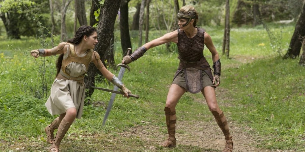 In the movie, that eventually means fighting in World War Two. There have been other movies and television shows in which a woman leads men into battle. In every other case I can think of, that’s depicted as a woman doing something transgressive, doing something women aren’t supposed to do. In other movies, it’s usually explained as an extension of some maternal instinct. They’re momma lions fighting to protect their families and the families of their people. That’s all very commendable, but it’s also very traditional.