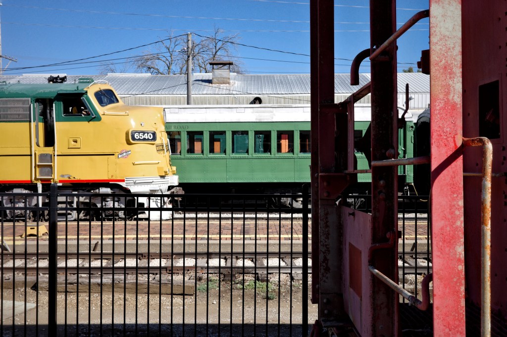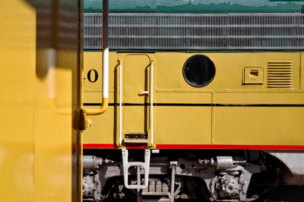 I hadn’t anticipated being fascinated by the shapes and forms, particularly of the works of the undercarriage (if that’s what it’s called). Everything was so massively sturdy. And I was completely captivated by the colors–the sun-faded greens, the bright yellows and oranges, the weathered reds and russet browns of the cars. I could have spent an hour just looking at the variety of textures and photographing the industrial weirdness of the undercarriage.