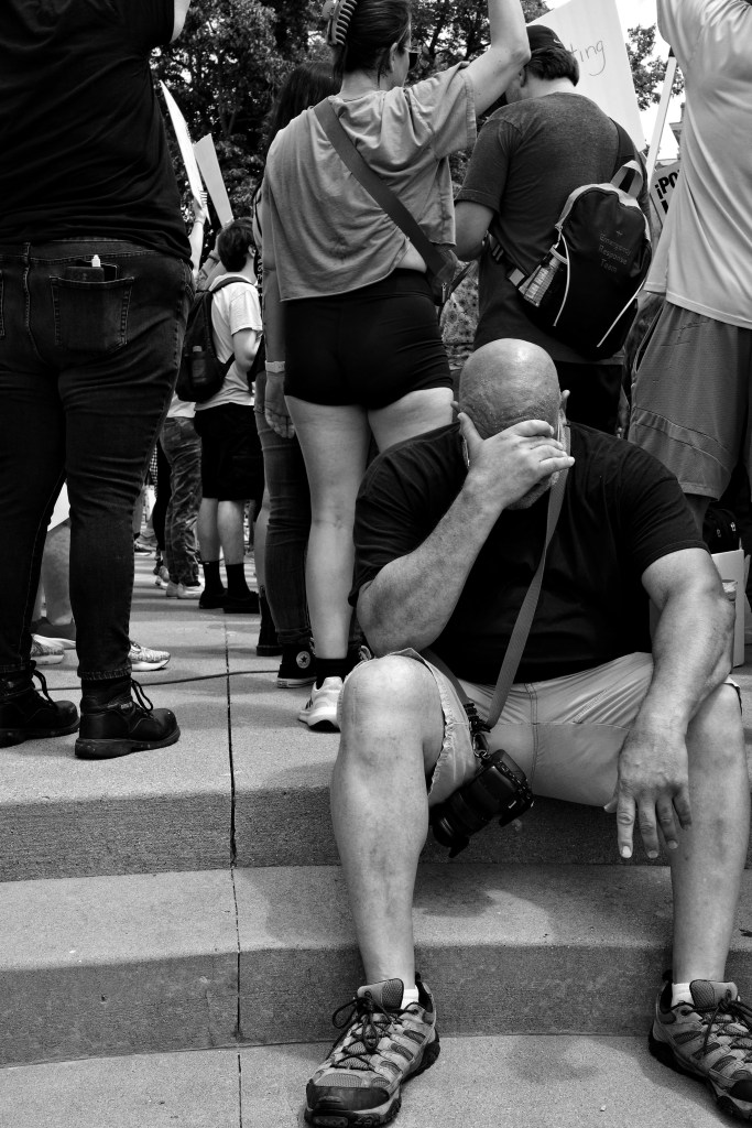 I was noodling around the edges of a demonstration and saw this guy, overcome with emotion (and maybe the heat), turn away and sit down. He was a big guy, bald, looked strong; not gym-strong, but work-strong. The anguish on his face was hard to look at but strangely beautiful. It was probably a moment he’d rather not have in public…but he did.