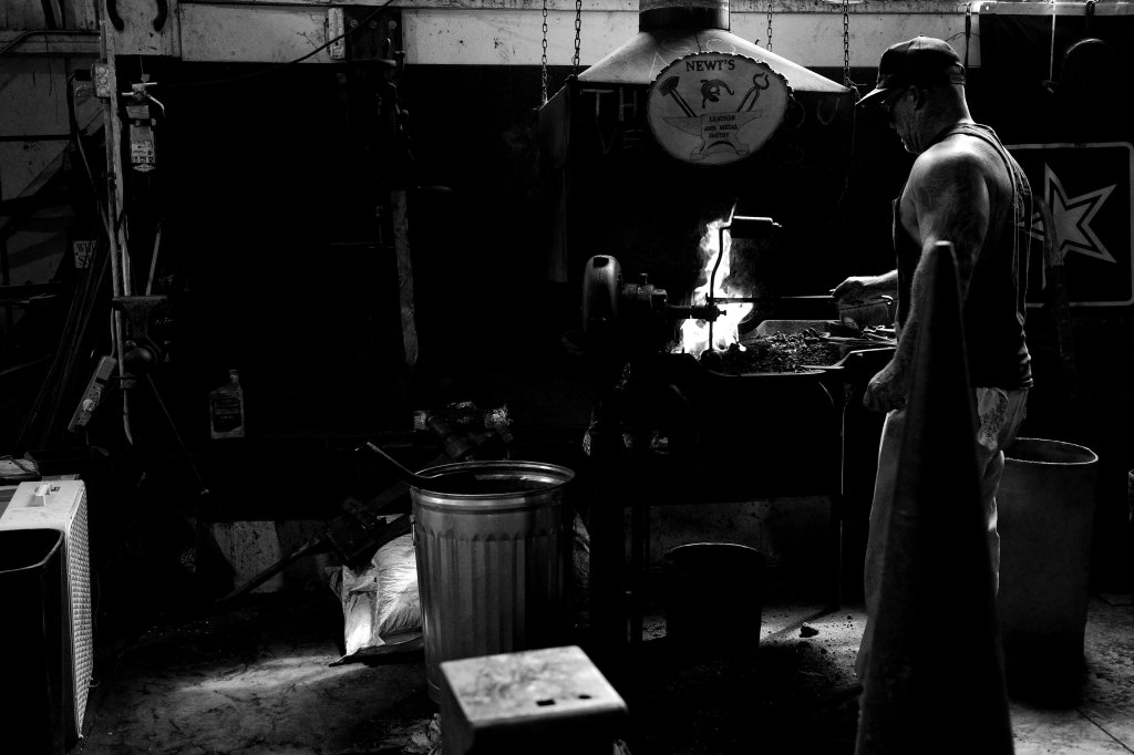 This photo is less personal, more emotionally distant, more analytic. It’s not about the guy doing the work; it’s more about the mythos of blacksmithing–the narrative of the smithy, the cultural representation of blacksmithing. It has a more primitive vibe. Where the color photo is about warmth, this is about heat and fire.