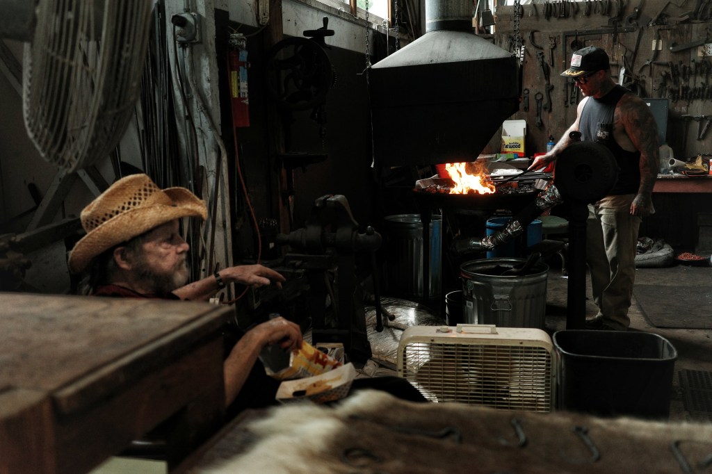 The photograph above is, I think, a very human photo. It’s as much…or more…about the people in the photo as it is about blacksmithing. The light cast by the flame and the high windows softens everything. It gives the image an almost cozy feeling.