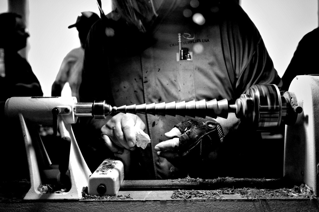 That’s one of the many advantages of digital photography. Almost every modern digital camera allows you to quickly shift back and forth between color and monochrome. I have my Ricoh GR3X set up with two different color profiles and a high contrast monochrome profile. When I saw this guy demonstrating wood-turning on a small lathe, I knew his brown-green smock would interfere with the color of the wood. A turn of a dial, and problem solved.