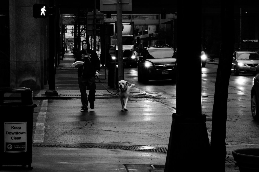 Yesterday on Bluesky I posted this photograph. It’s not about the haecceity of the dog (who was a wonderfully irreducible and highly individual dog named Luka) or his quiddity (although there was a lot of dogness going on with Luka) or the guy or the street or the city. It’s not about any THING.