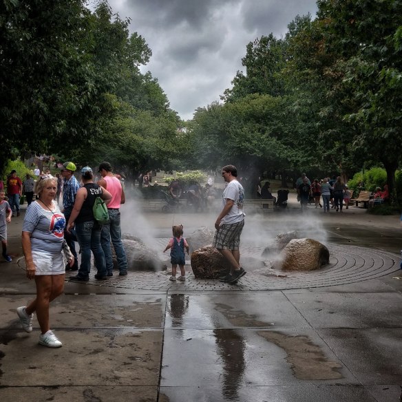 Now, here’s me loafing on a Sunday morning, drinking coffee, scrolling through Bluesky, and I see a post by my friend Kim Denise. It’s about knitting, a subject in which I have absolutely no interest at all; something to do with ‘fingering/4-ply/sock yarn,’ whatever that means. But she’s included a delightful photo of a young girl wearing a colorful knit jacket thingy, pushing a wheelbarrow. Kim explains, “This is a long cardigan/coat I made for a young friend of mine who was four at the time. She requested a number of specific elements. She wore it for years!“