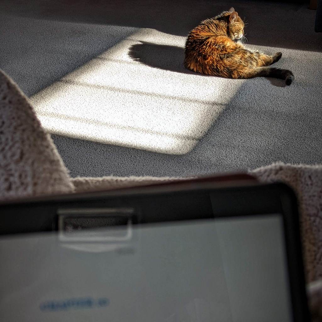 Yesterday afternoon, I was sitting in a comfortable chair reading, a blanket on my lap, and the cat on the blanket. When the sun came through the transom, the cat got off my lap and laid in the sun. Every so often I looked up from my tablet and saw that the sunny spot and the cat had moved. It occurred to me that my reading goals and plans were similar to the cat’s napping goals and plans. Her goal is to nap in a sunny spot. When that sunny spot moves, she moves with it. My goal is to finish one book and start another.