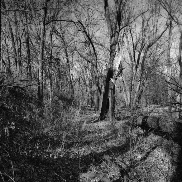 So my brother and I, we were out sylvan geocaching, right? In the woods surrounding the Sycamore Trail on a singularly lovely day for early December. Almost 50F, sunny, not much of a breeze. Couldn’t ask for a better day to be noodling around in the woods sylvan geocaching. We didn’t stay on the trail, of course. We wandered through the flood plains, we slumped around the marshy oxbows, we pushed our way through the dry brambles, we clambered over the levee.